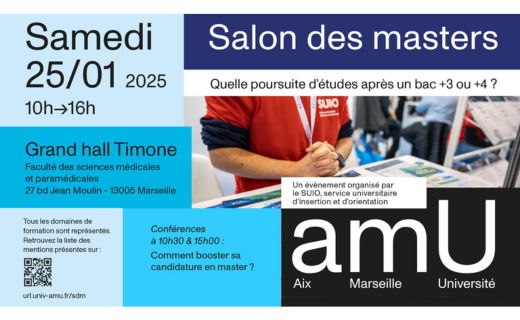 Come and see the heads of masters at the Master's Fair organized by Aix-Marseille University this Saturday, January 25, 2025, from 10 AM to 4 PM on the Timone Campus in Marseille.