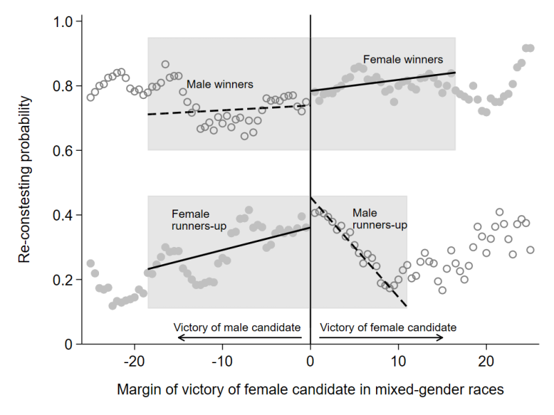 Figure. Re-contesting probability of runners-up and winners by gender in mixed-gender races.