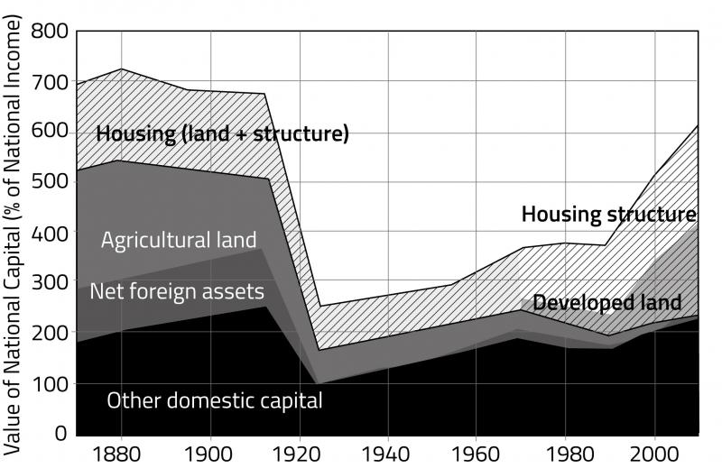 Uniform taxation of wealth is making a comeback as a response to rising public debt and increased inequality in most Western countries. This paper enters this debate from the striking observation that the housing component of national private wealth explains the spectacular rise of wealth relative to national income in several countries. Rising housing wealth is in major part due to the rise in land prices. Figure 1 represents the historical evolution of wealth-to-income ratios in France and the UK, using Piketty’s decomposition into housing, agricultural land, net foreign assets and other domestic assets.
