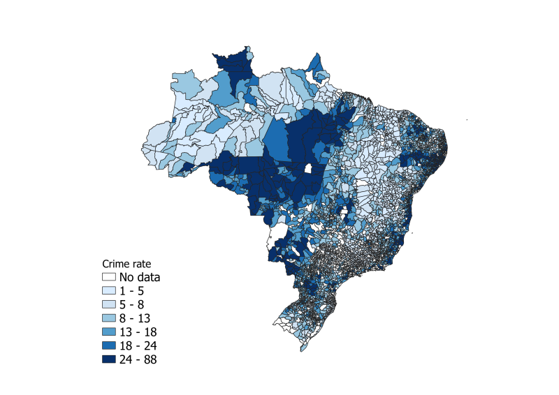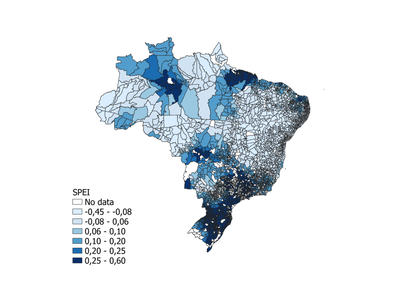 My analysis seeks to contribute to this debate by making use of variation in weather conditions across Brazilian municipalities to identify their effects on homicide rates. It makes a first attempt to discern weather effects on a broader set of economic and non-economic factors. Economic channels include not only agricultural output, but also all forms of economic activity, labor market response, poverty, inequality, local government budgets, and public services. In this regard, Brazil offers an excellent context to study the crimeweather nexus for several reasons. First, Brazil is one of the world’s leading agricultural producers, with exports of agricultural raw materials representing around 19% of its total exports and total agribusiness in terms of agriculture and industrial food production accounting for 35% of its exports in 2018. Second, agriculture in Brazil remains largely rain-fed and depends extensively on manpower, 35% of the country’s total workers being employed in the agriculture sector. It follows that adverse weather shocks like droughts can represent a major blow to agriculture-generated revenues and earnings. A recent example of this was the 2014-2017 period, during which the country witnessed the worst drought season in 100 years, which led to disruptions in the production of coffee beans and sugar and the downsizing of operations. Finally, Brazil’s homicide rate is very high, reaching 30.8 homicides per 100,000 inhabitants, compared to a world rate of only 6 homicides. To illustrate, Fig.1 depicts the spatial distribution of average homicide rates and level of drought as measured by the Standardized Precipitation-Evapotranspiration Index (SPEI). It shows higher homicide rates (left plot) in municipalities with high levels of drought (right plot).