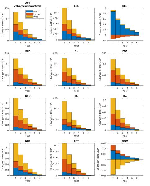 We extend the analysis to a fully dynamic setting with capital mobility, partially stickyy wages. Figure 3 shows that the production network matters for cumulative responses when monetary policy in the EZ set by a Taylor rule which targets country weighted overall EZ CPI inflation.