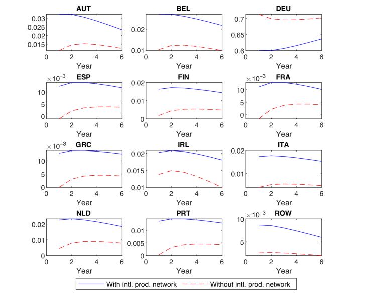 Figure 1 presents this decomposition for our calibration on 12 countries: 11 countries of the Eurozone (EZ hence after) and the “rest of the world”. The model is calibrated using the measures of input-output connections from the World Input-Output Database for this set of countries.