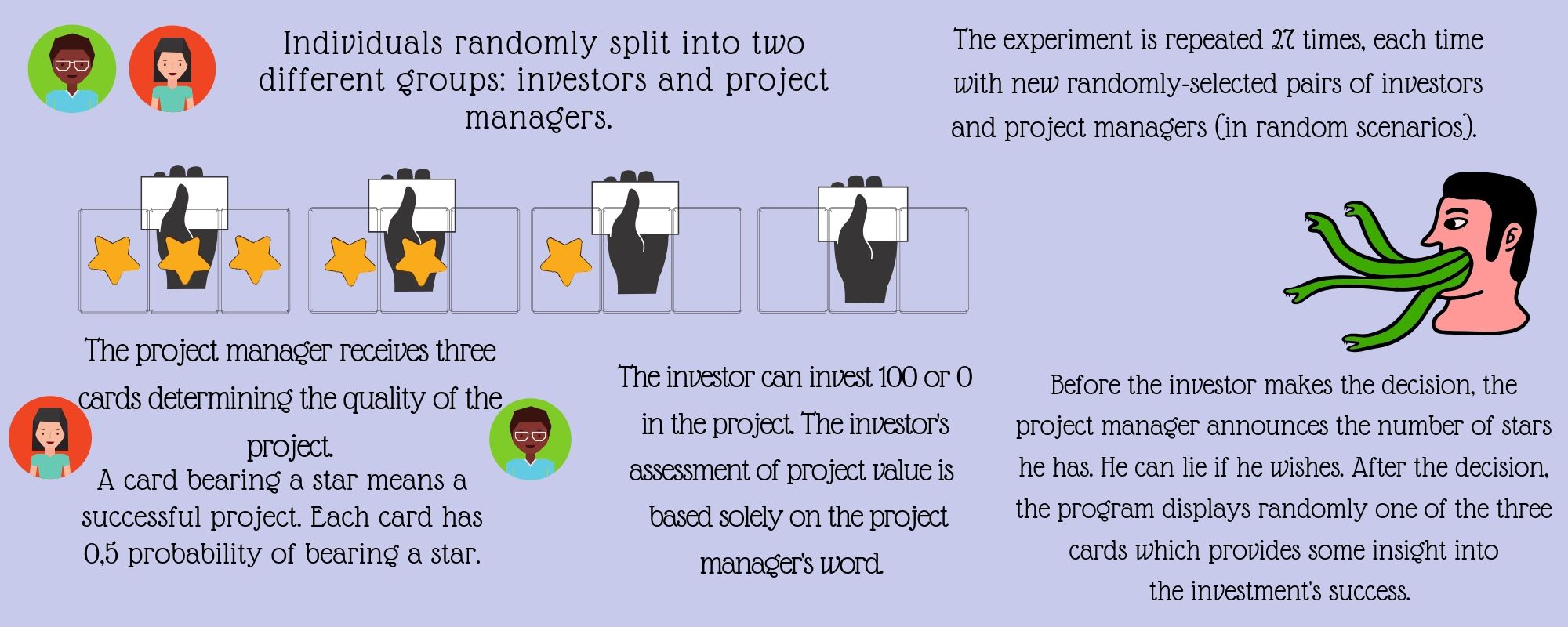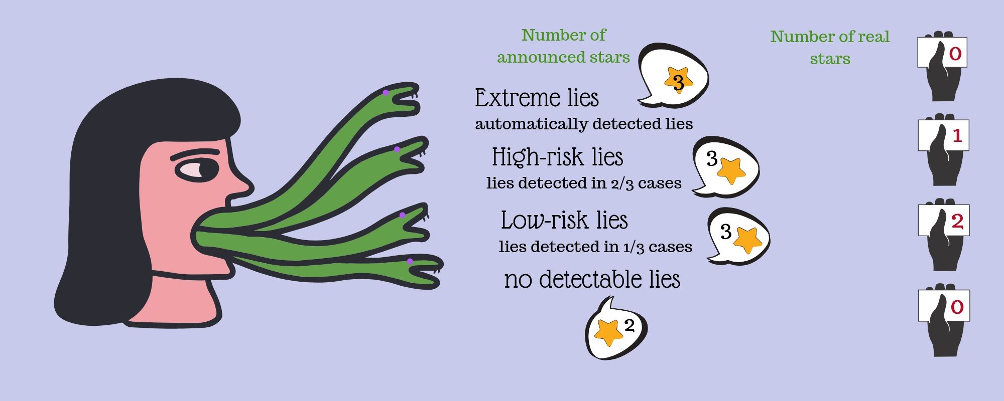 On this point, whether in the market or in life, little lies differ from big ones. Some lies are extreme, such as announcing a three-star project when the project is not actually worth one star. By contrast, other lies cannot even be identified because of their subtlety. For instance, presenting two good projects (out of a possible three), when in reality the manager only has one. In this case, the investor can interpret a poor random draw as bad luck. How can reputation and competition influence the nature of lies? To study this, researchers identified four types of lie.