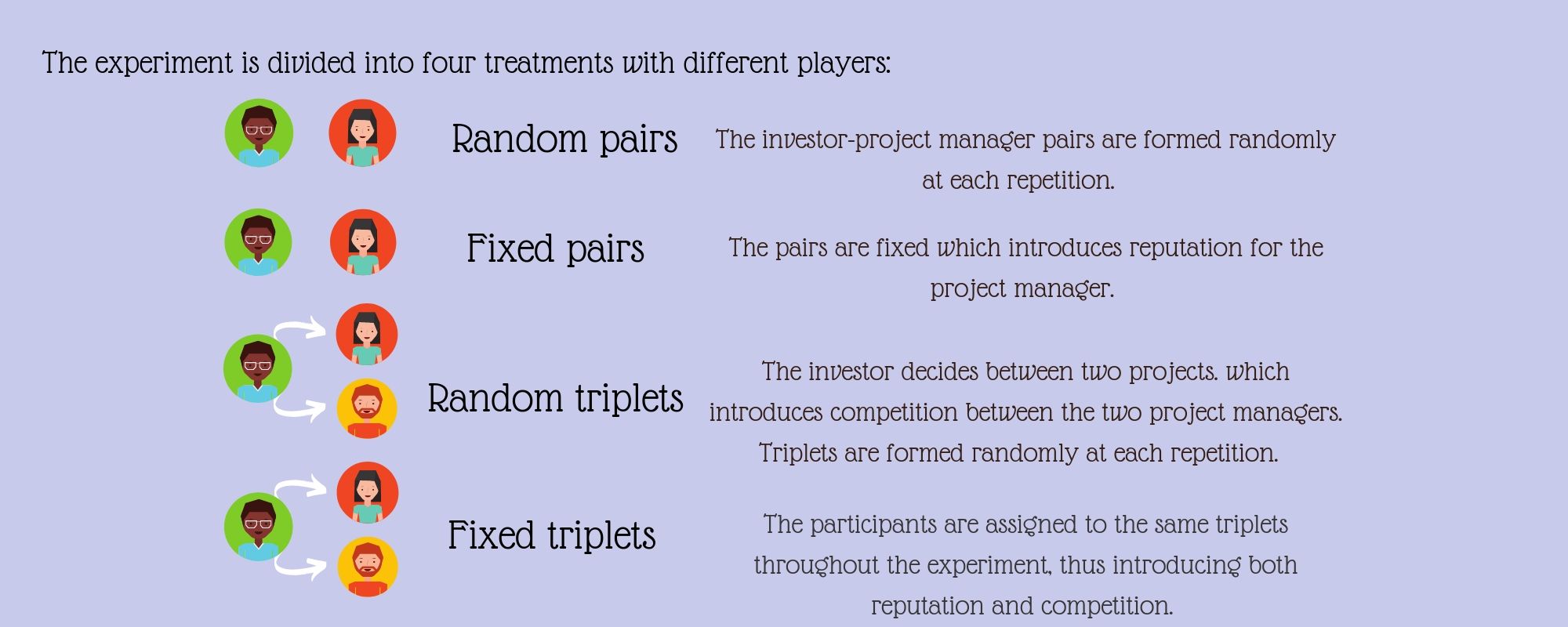 To reproduce competition in financial markets, some treatments linked one investor to two project managers. The other aspect studied, reputation, gave project managers the opportunity to build their reputation through fixed matching. The goal of this experiment was to assess the impact of market institutions (competition and reputation) on the honesty of individuals.