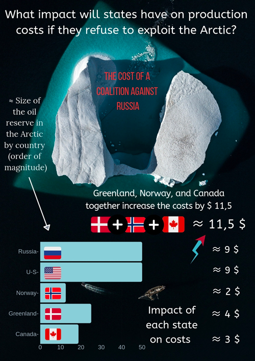 At the moment, if Russia decided to extract fossil resources alone, the production costs would be around $100 per barrel. If all Arctic countries invested in the extraction, this cost would be reduced to $56. But what would happen if some countries decided to form a coalition to prevent oil extraction? What impact on the cost of production might it have? We estimated each state’s impact on market size in relation to the size of their prospective reserves. 6 7