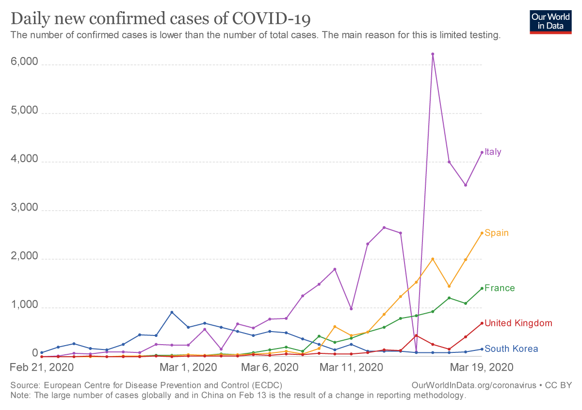 At the time this note is being written, the world is trying to cope with a quickly expanding pandemic related to COVID-19. The latter virus is a new strain of coronaviruses at the origin of an outbreak that started in China, possibly as early as November 17, 2019, when patient zero was supposedly contaminated. The World Health Organization was alerted on this outbreak on December 31 and the spread of the virus has since then gone global, to now reach 155 countries. Geographically though, it is not the case that all countries were exposed to COVID-19 at the same time. Obviously, populations in South-Asian countries that are close to China got contaminated earlier than, say, European citizens. This simple fact enables one to compare how the virus spread in different countries, which is the outcome of how people and public authorities have reacted. It is instructive, with such a mindset, to compare South Korea with France, Italy, Spain and the United Kingdom.