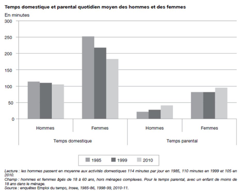 La différence salariale en France peut être, en partie, expliquée. D’abord, les femmes sont plus susceptibles d’occuper des postes à temps partiel. Généralement moins reconnu, le temps partiel est aussi moins bien rémunéré. Cette propension à occuper des postes aménagés est en partie due aux responsabilités qui leur incombent plus souvent dans le domaine familial :