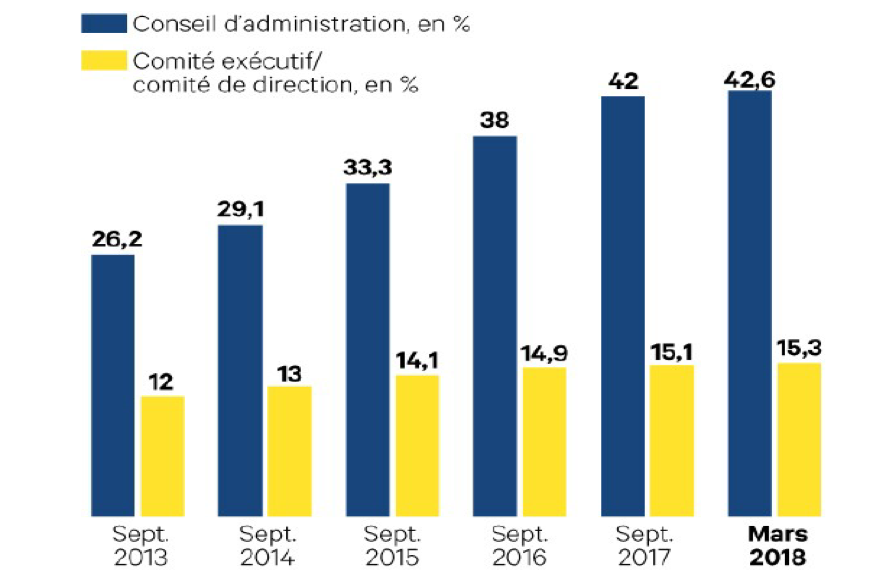 Au-delà, la différence salariale est aussi la conséquence des choix de formation et d’étude. Les femmes ne s’orientent pas vers les mêmes secteurs que les hommes. Les domaines de l’éducation ou du social sont plus prisés par les femmes par exemple. Mais ce ne sont pas les mieux rémunérés. Et, au-delà des secteurs, les femmes sont sous-représentées dans les postes à responsabilité. Il y a généralement plus d’infirmières que de médecins par exemple. Dans l’administration, une loi de janvier 2017 a voulu rééquilibrer la donne en imposant un minimum paritaire de 40% pour les postes à direction. L’impact de cette loi est notoire. Mais les inégalités persistent avec force dans d’autres domaines, comme dans les conseils exécutifs ou les comités de direction :