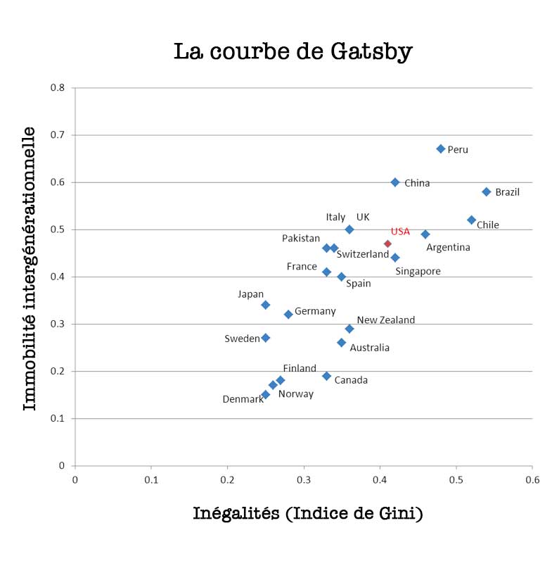 L’égalité des chances se réfère à la mobilité. La mobilité intergénérationnelle de revenu interroge la possibilité qu’a un enfant d’accroître facilement ses revenus par rapport à ses parents. Mais on peut aussi la comparer d’une période à l’autre de la vie d’un individu, de manière intragénérationnelle. Combien pourraient, à l’instar de Gatsby le Magnifique -ce personnage, issu d’une famille de fermiers pauvres et devenu millionnaire - se hisser au sommet de l’ascenseur social ? Dans chaque pays, la réponse diffère. Mais une constante traverse un bon nombre de situations. Selon « la Courbe de Gatsby », l’augmentation des inégalités est liée à une faible mobilité sociale.
