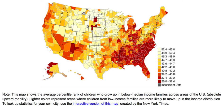 Cette carte montre le rang moyen (en pourcentage) d'enfants ayant grandit dans une famille située en dessous du revenu moyen en fonction des aires géographiques. Les couleurs claires représentent les aires où les enfants issus de familles à faibles revenus ont plus de chance d'accroître leur futur salaire.