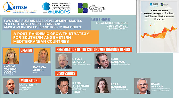 The Center for Mediterranean Integration (CMI), Aix-Marseille School of Economics (AMSE) and The Growth Dialogue invite you to a high-level event on "A Post-Pandemic Growth Strategy for Southern and Eastern Mediterranean Countries".