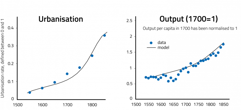The feedback mechanism between city size and technology generates a novel set of growth dynamics. A shock to urbanisation results in knowledge creation and diffusion, higher manufacturing productivity and a flow of labour into manufacturing (and thus cities). The resulting higher urban density further increases manufacturing productivity, setting off a process of sustained growth. Our model hence makes urbanisation – as opposed to industrialization – the key element in a theory of development. Figure 2 reports the evolution of urbanisation and output in the model (continuous lines), as well as those observed in the actual data (dots). The trigger for the growth process is an exogenous shock to agricultural productivity that shifts labour into manufacturing, increasing urban density and thus raising productivity. The shock can hence create a virtuous circle, in which urbanisation and productivity keep increasing. Note that the model reproduces the acceleration in urbanization and in output that we see in the data.