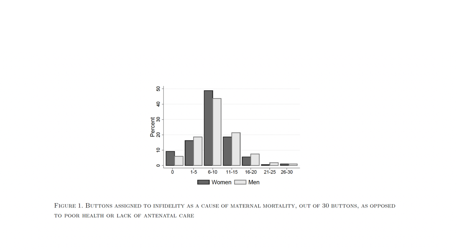 In the study, the authors gave 30 tokens each to the participants and asked them to assign a number of tokens to each possible cause of birth complications, in line with its importance. The graph below presents the number of tokens for the “infidelity” cause and the percentage of participants. For instance, 50% of women assessed infidelity at 6 to 10 tokens.