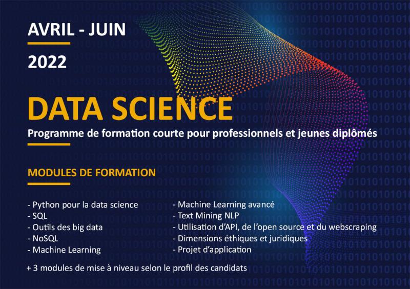 Forte de son expérience en formation initiale orientée Big Data, AMSE propose un programme court de 10 modules de formation en Data Science pour les professionnels, dans le cadre de la formation continue. 23 journées réparties sur 3 mois et un Diplôme d’Etudes Supérieures Universitaires (DESU) délivré par Aix-Marseille Université à la clé !