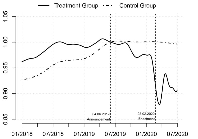 Source. Author’s visualization based on data provided by VALUE Marktdaten. Notes. The indices show the general trend of prices in the treatment versus control group between 2018 and the end of the second quarter 2020.