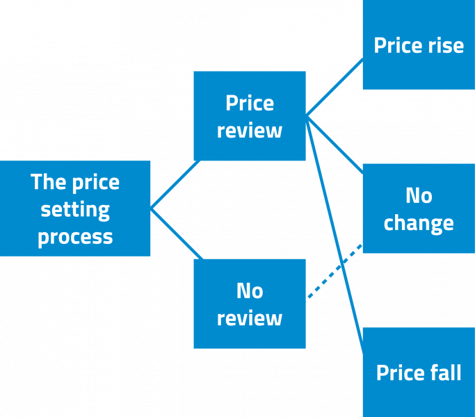 As noted, it is assumed that a firm’s decision process regarding price changes can be split into two stages. Firms first decide whether or not they should perform a price review. This decision can be time-dependent (reviewing prices on a regular basis, such as once a year, every January for example) or state-dependent (reviewing when faced with significant changes in their environment, such as sharp input price fluctuations). Once firms have implemented a price review, the second stage involves deciding whether to change (raise or lower) their prices or to maintain them. Obviously, if firms do not review their prices, the assumption is that they leave them unchanged (unless there is an automated price change rule, which is unlikely given the low inflation experienced since the 1990s).