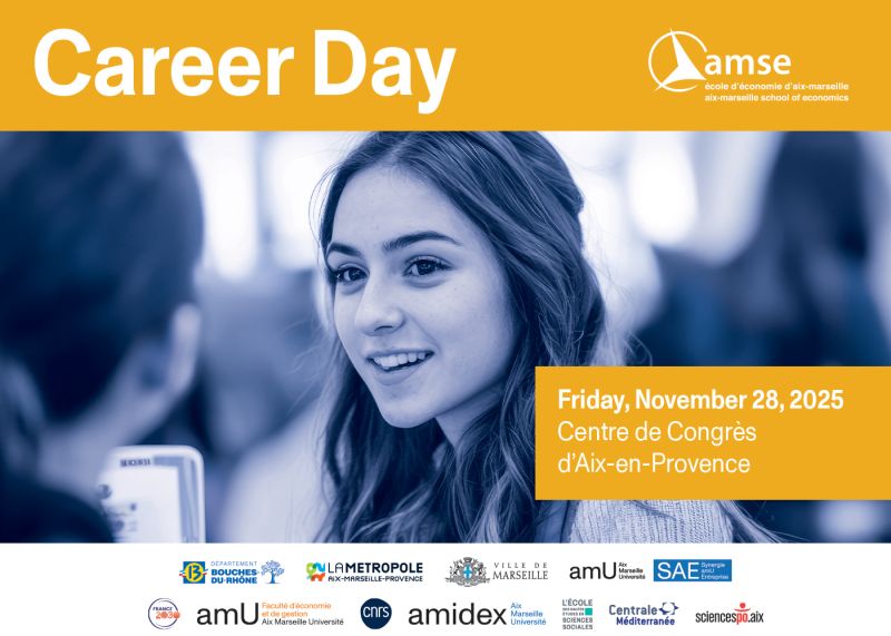 - Après-midi : forum des entreprises en présence de nos partenaires Air Liquide, Airbus, AXA, Banque de France, BNP Paribas, Caisse d'Epargne CEPAC, Capgemini, CFM Indosuez Wealth Management, CIC Lyonnaise de Banque, CMA CGM, Command Strategy, Compagnie Fruitière, Crédit Agricole Alpes Provence, ENGIE, Equancy, European Central Bank, FERDI, France Assureurs, Free-lance Léonor Extremet, FundSight, Groupe atlantic, Institut National de la Statistique et des Études Économiques (Insee), IVESTA Family Office, J-PAL Africa, Keyrus, Le Crédit Lyonnais, Métropole Aix-Marseille-Provence, Onepoint, ORS PACA, Pépite Provence, POST Luxembourg, Quadrat-études, Seqlense, Terradona, Unédic, Union Investment Luxembourg, University of Barcelona, Vaisala, Ville de Marseille, Weefin, Windcliff Partners. Le service de Formation Continue participera également pour renseigner les étudiants sur l'alternance, et un doctorant AMSE tiendra un stand pour échanger avec les étudiants qui s'interrogent sur la poursuite de leurs études en thèse.
