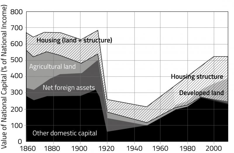 Uniform taxation of wealth is making a comeback as a response to rising public debt and increased inequality in most Western countries. This paper enters this debate from the striking observation that the housing component of national private wealth explains the spectacular rise of wealth relative to national income in several countries. Rising housing wealth is in major part due to the rise in land prices. Figure 1 represents the historical evolution of wealth-to-income ratios in France and the UK, using Piketty’s decomposition into housing, agricultural land, net foreign assets and other domestic assets.