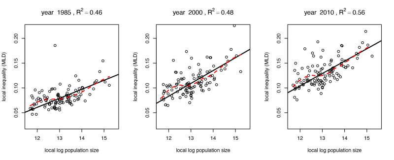 In SEI (JOEI, 2024, with M. Trede) we innovate by taking a spatial perspective to explain the dramatically increased earnings inequality in Germany. Measuring inequality locally at the level of cities / travel-to-work areas annually since 1985, we find that behind this development is the rapidly worsening inequality in the largest cities, driven by increasing earnings polarisation. In the cross-section, local earnings inequality rises substantially in city size, and this city-size inequality penalty has increased steadily since 1985, reaching an elasticity of 0.2 in 2010. To illustrate this, Figure 1 depicts a series of yearly scatter plots of inequality and city size (for full-time prime aged male earners in the West), as well as fits of a univariate regression line (solid black) sporting a remarkable R2 statistic, and a non-parametric estimate (dashed red) that confirms approximate linearity. Examining the local earnings distributions directly reveals that this is due to increasing earnings polarisation that is strongest in the largest places.