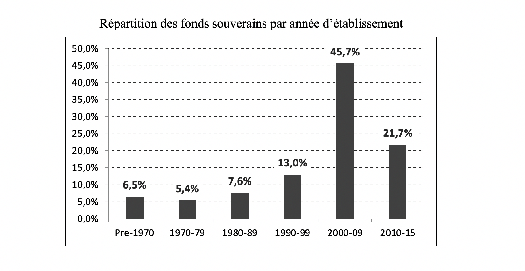 Selon les auteurs, il y aurait environ 78 fonds souverains – des fonds de placements financiers détenus par des États - aujourd’hui , représentant pas moins de 7,4 trillions de dollars12. Le boom des produits de base dans le début des années 2000 a catalysé cette rapide ascension mais la dynamique n’a pas cessé depuis lors. Quelles sont les raisons d’un tel engouement ? Les chercheurs ont étudié 43 fonds, établis par 37 États sur la période 2005-2014 pour le savoir.
