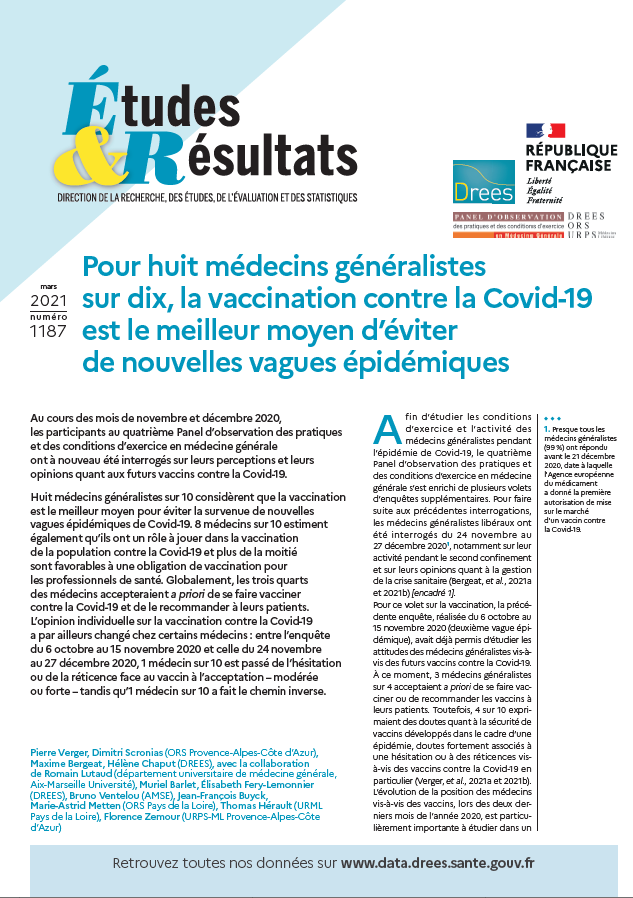 Huit médecins généralistes sur 10 considèrent que la vaccination est le meilleur moyen pour éviter la survenue de nouvelles vagues épidémiques de Covid-19. 8 médecins sur 10 estiment également qu’ils ont un rôle à jouer dans la vaccination de la population contre la Covid-19 et plus de la moitié sont favorables à une obligation de vaccination pour les professionnels de santé. Globalement, les trois quarts des médecins accepteraient a priori de se faire vacciner contre la Covid-19 et de le recommander à leurs patients. L’opinion individuelle sur la vaccination contre la Covid-19 a par ailleurs changé chez certains médecins : entre l’enquête du 6 octobre au 15 novembre 2020 et celle du 24 novembre au 27 décembre 2020, 1 médecin sur 10 est passé de l’hésitation ou de la réticence face au vaccin à l’acceptation – modérée ou forte – tandis qu’1 médecin sur 10 a fait le chemin inverse.