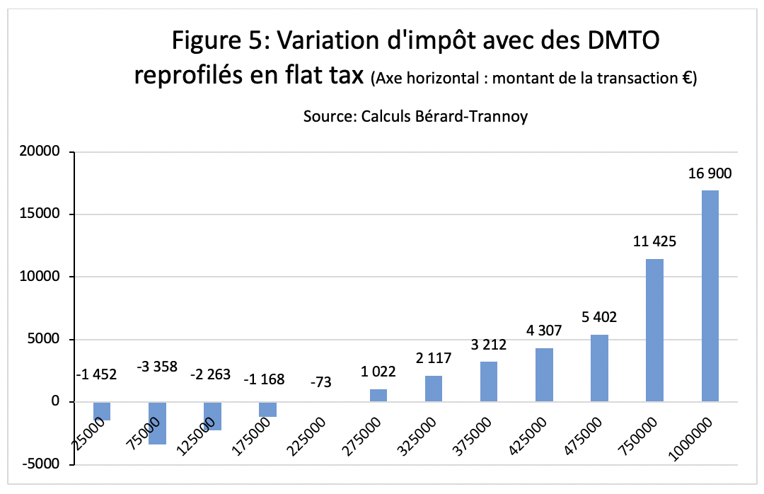 Le jugement sur l’opportunité de faire une telle réforme peut être altéré par plusieurs considérations. D’abord, on peut trouver que les montants épargnés pour de petites transactions sont trop faibles pour que le jeu en vaille la chandelle. Ensuite on peut arguer que beaucoup de transactions de faible montant portent sur des terrains et qu’en raison de la réforme, leur prix augmenterait d’autant, de telle sorte que la réforme serait captée par les vendeurs. Des effets de report entre le régime dérogatoire et le régime de droit commun peuvent être aussi suspectés. Bref, loin de nous de penser qu’il s’agirait d’une réforme idéale. Toutefois, le calibrage proposé est intéressant dans la mesure où il indique les limites de l’exercice de ce que l’on peut proposer à recettes fiscales constantes de droits de mutation pour rendre le système un peu moins désincitatif en termes de mobilité.