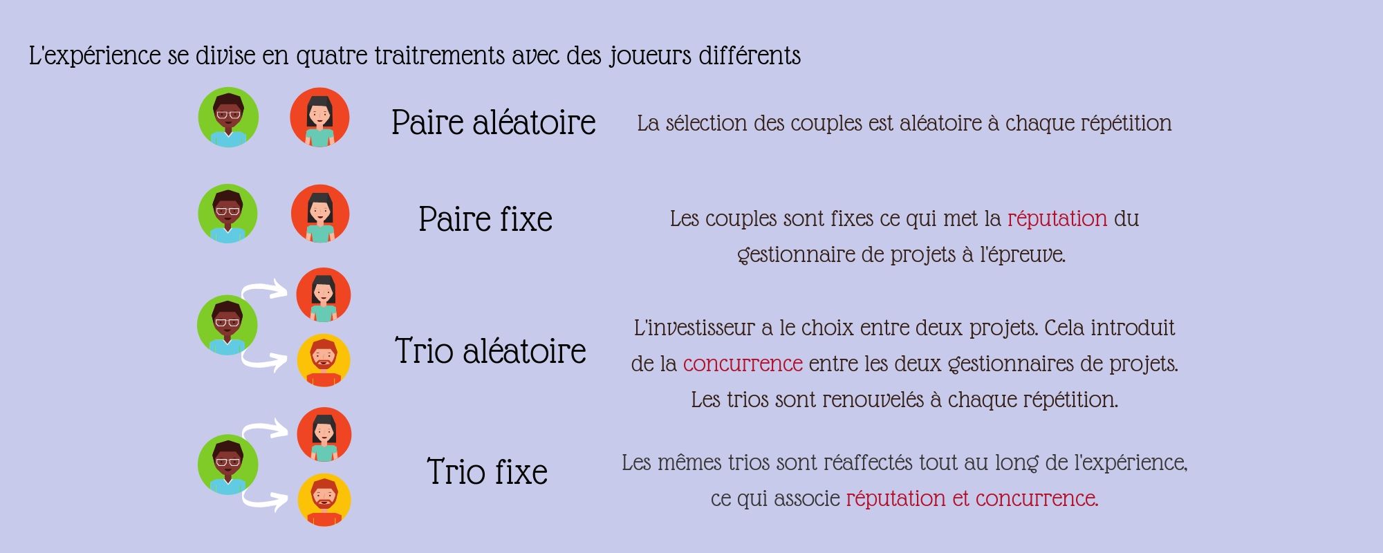 Pour reproduire la concurrence sur les marchés financiers, dans certains traitements chaque investisseur est apparié à deux gestionnaires de projets qui sont en concurrence pour attirer les fonds de l’investisseur. L’autre dimension du marché qui est manipulée est la possibilité ou pas pour les gestionnaires de projets de se créer une réputation. Le test permet d’évaluer comment les institutions de marché (la concurrence et la réputation) affectent l’honnêteté des individus.