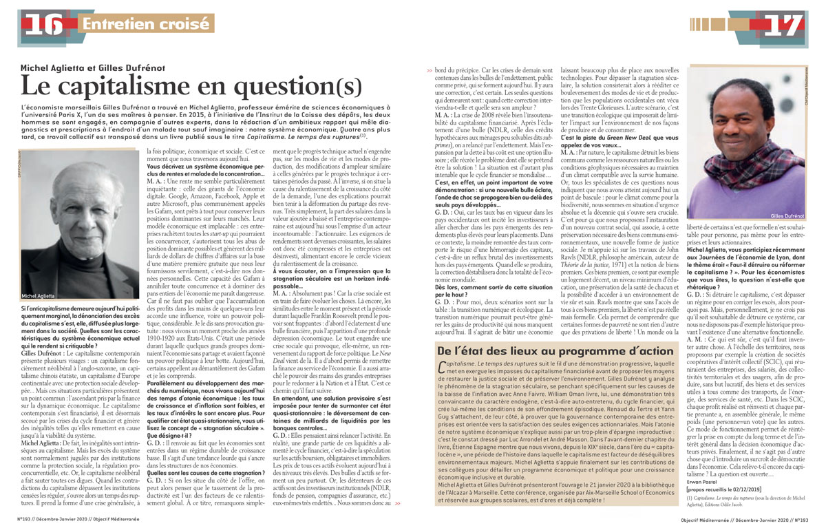 Mardi 21 janvier 2020 à Marseille, les économistes Michel Aglietta et Gilles Dufrénot ont donné une conférence scolaire intitulée "Capitalisme, le temps des ruptures".
