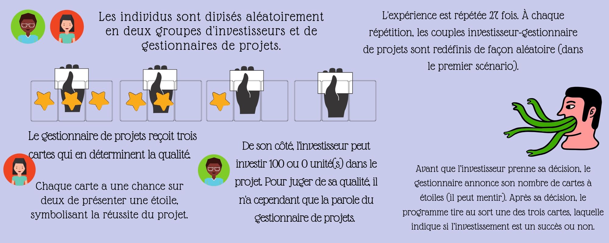 Marie Claire Villeval, économiste et directrice de recherche au CNRS, fait appel à l’étude comportementale pour offrir une réponse. Cette branche de la discipline s’intéresse aux comportements individuels et collectifs en recréant les conditions présentes sur un marché. Dans une expérience développée avec Chloe Tergiman, professeur adjointe à Penn State University3, plus de 600 personnes ont participé à un jeu dans lequel interagissent un gestionnaire de projets et un investisseur, qui décide, selon la qualité espérée du projet, de prêter son argent pour sa mise en œuvre. Les participants dans le rôle des gestionnaires de projets bénéficient d’informations privées sur la valeur de leur portefeuille de projets auxquelles n’ont pas accès directement les investisseurs potentiels. Dès lors, les gestionnaires de projets peuvent être tentés de surévaluer la qualité annoncée de leurs projets pour attirer à eux les investissements.