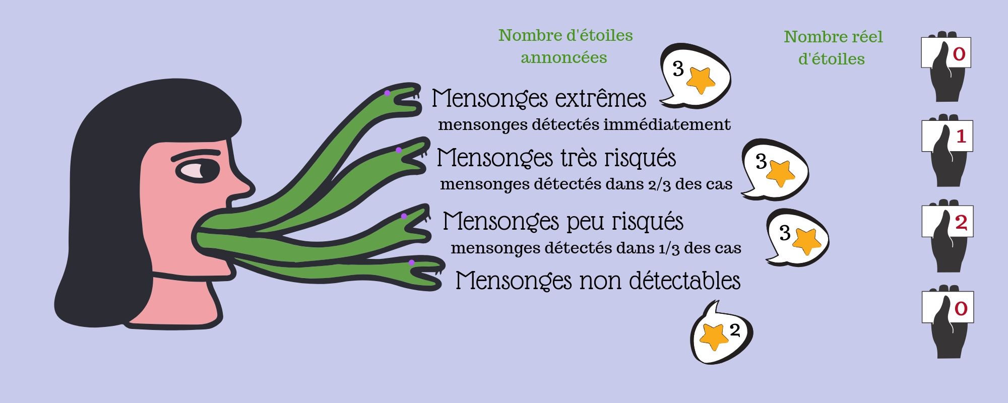 Sur ce point, sur le marché comme dans la vie, petits et gros mensonges ne se valent pas. Certains mensonges sont extrêmes. C’est le cas par exemple lorsque les gestionnaires de projets annoncent n’avoir que des projets à haute valeur alors même qu’ils savent que tous leurs projets sont mauvais. En revanche, d’autres mensonges, plus petits, ne peuvent pas être identifiés. C’est le cas par exemple lorsque les gestionnaires de projets annoncent deux bons projets alors qu’ils n’en ont qu’un : le tirage au sort d’un projet décevant peut être interprété par l’investisseur comme un manque de chance. Quel impact la concurrence et la réputation peuvent-elles avoir sur la nature des mensonges et leur gravité ? Pour l’étudier, les chercheuses ont identifié quatre types de mensonges.